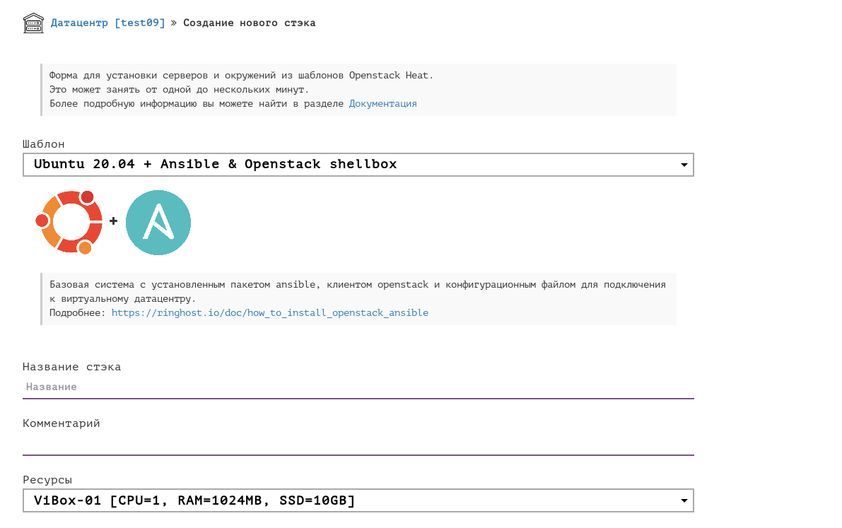 Установите виртуальный сервер из шаблона 'Ansible & Openstack' или пройдите установку софта по инструкции в статье Установка клиента Openstack и подключение Ansible.