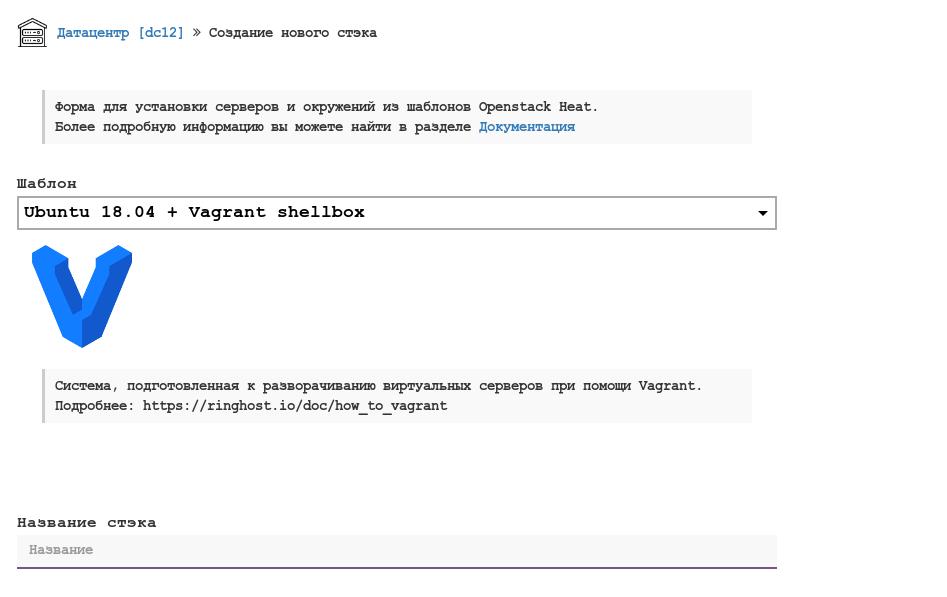 Vagrant - инструмент для создания виртуальной среды, написанный на языке Ruby. Вы можете создать сервер c установленным Vagrant, полностью настроенный и готовый к работе с датацентром, используя форму установки окружения из шаблона Openstack Heat.