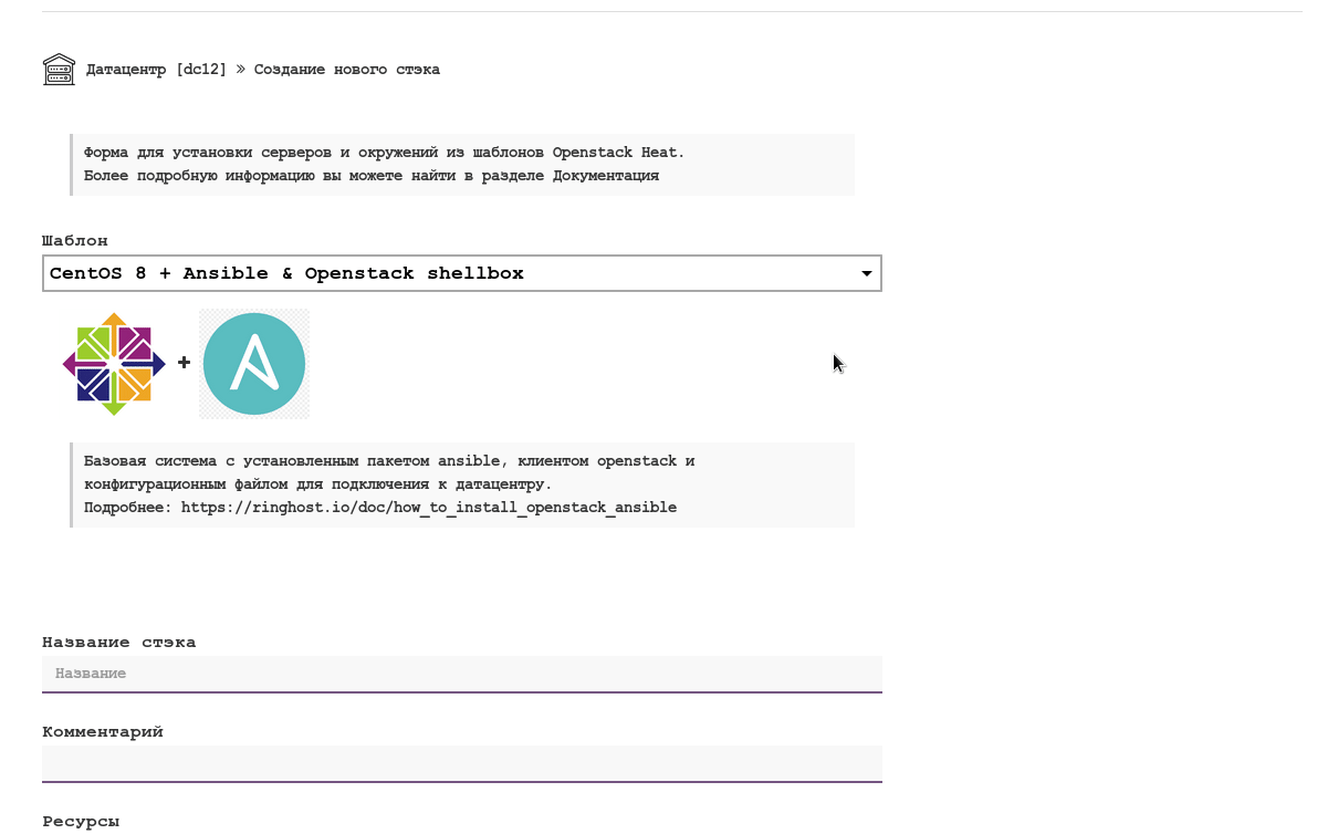 Окружение, созданное из такого шаблона в терминологии Openstack, называется стэком - Stack.