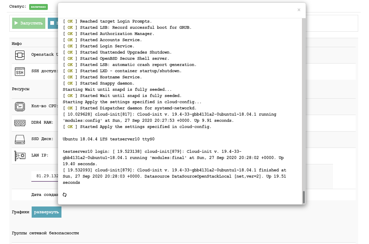 Процесс загрузки и выполнения cloud-init вы можете наблюдать в выводе сообщений в консоль, нажав кнопку